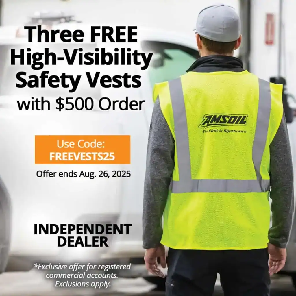 For a limited time, commercial accounts get three free AMSOIL high-visibility safety vests with their order of $500 or more when they use code FREEVESTS25 at checkout. The promotion runs Aug. 13-26, 2025.